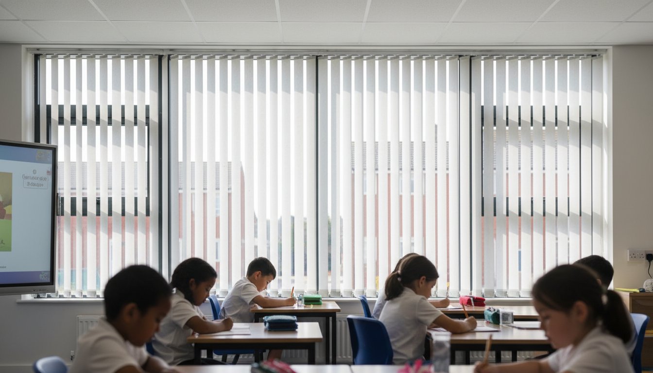 Modern school builds often feature expansive glass walls that require versatile light management. Vertical blinds are an excellent, cost-effective choice for these large areas, such as reception hubs or staff rooms. They offer precise light control through tilting slats, which helps reduce screen glare on laptops without plunging the room into darkness. Effective window treatments play a vital role in meeting school ventilation and thermal comfort standards, as they help manage solar gain while allowing windows to remain open for fresh air. For high-traffic areas, we suggest using weighted louvres without bottom chains to prevent tripping hazards and damage.